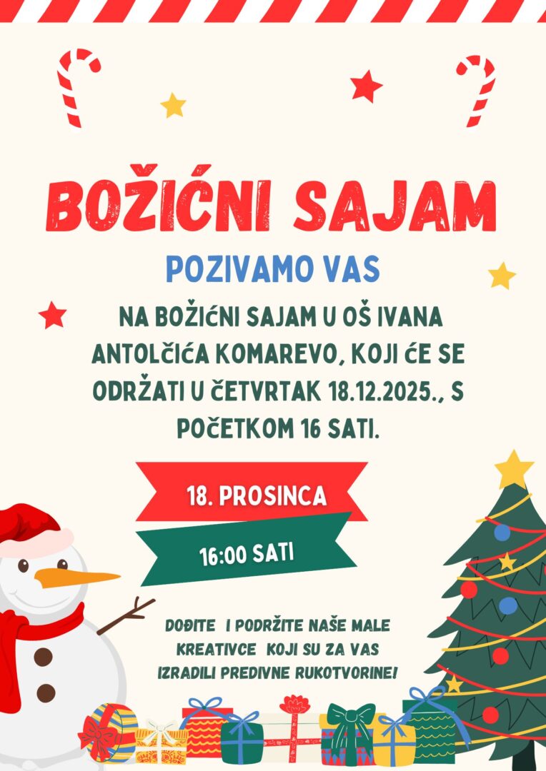s radošću Vas pozivamo na Božićni sajam u OŠ Ivana Antolčića Komarevo, koji će se održati u četvrtak, 18.12.2025., s početkom u 16 sati.