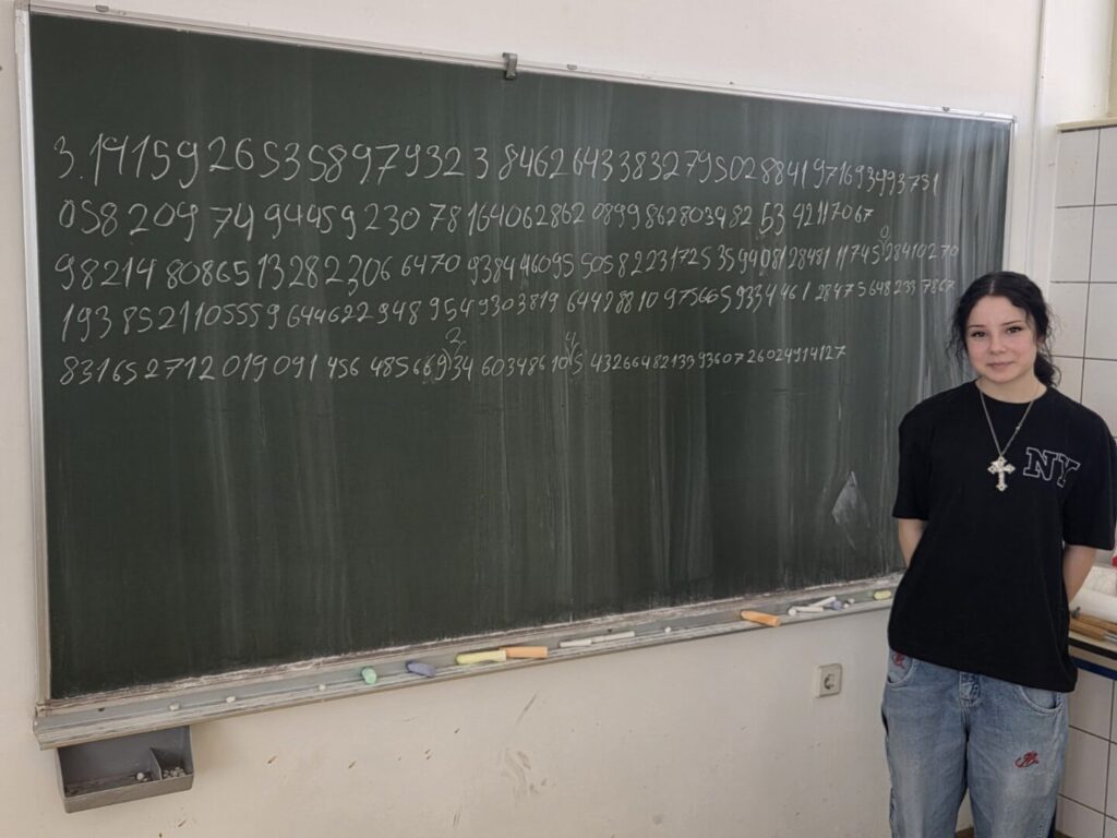 Učenica 8.razreda naše škole ,Magdalena Hernaut, napamet je naučila 300 znamenaka ovog beskonačnog boja,što nam je prezentirala ispisivanjem znamenaka na ploči.