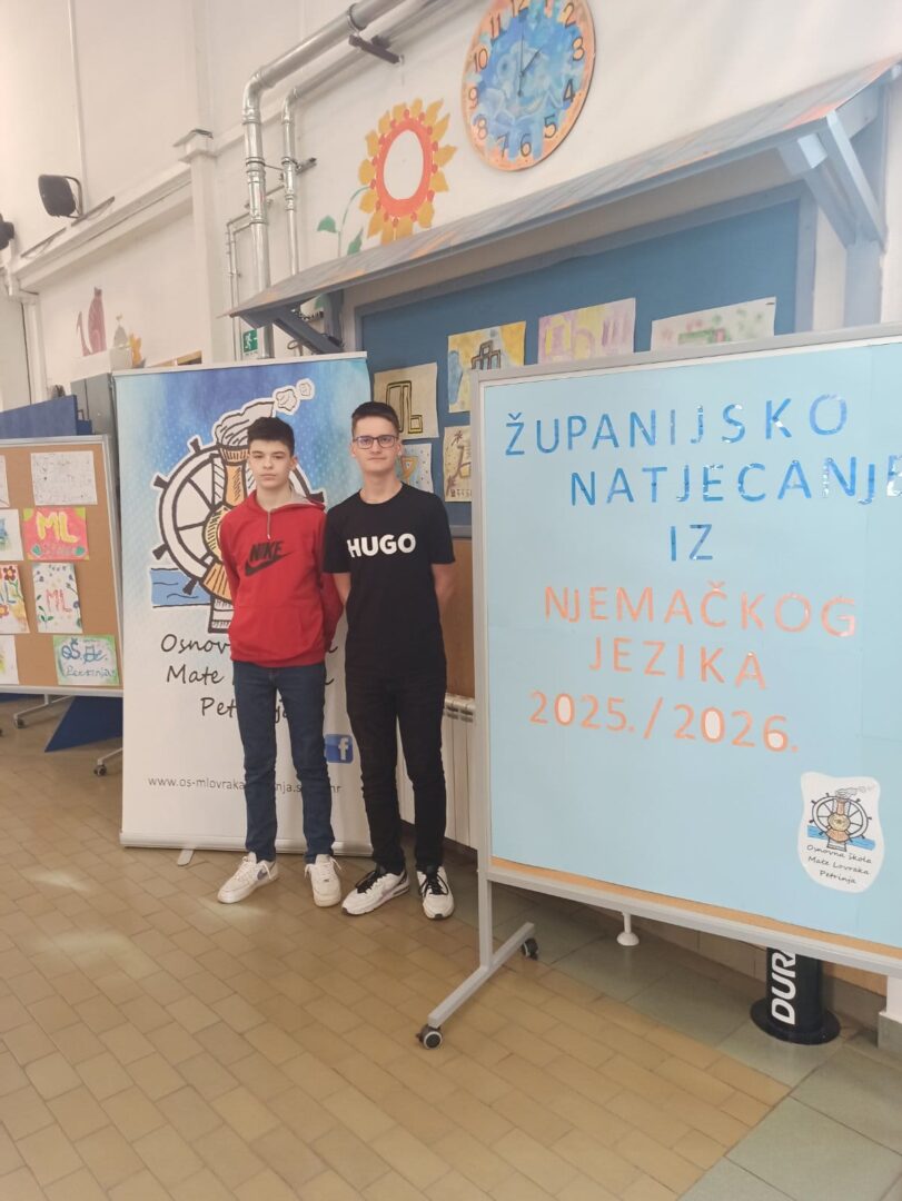 23. veljače naši učenici 8. razreda Matej Vincelj i Marin Ivković, sudjelovali su na Županijskom natjecanju iz njemačkog jezika uz mentorstvo učiteljice njemačkog jezika Ivane Zovkić Majnarić. Matej je osvojio 7. mjesto, a Marin 16. mjesto. Domaćin natjecanja bila je Osnovana škola Mate Lovraka Petrinja, a natjecalo se 20 učenika. Čestitamo na ovom uspjehu!